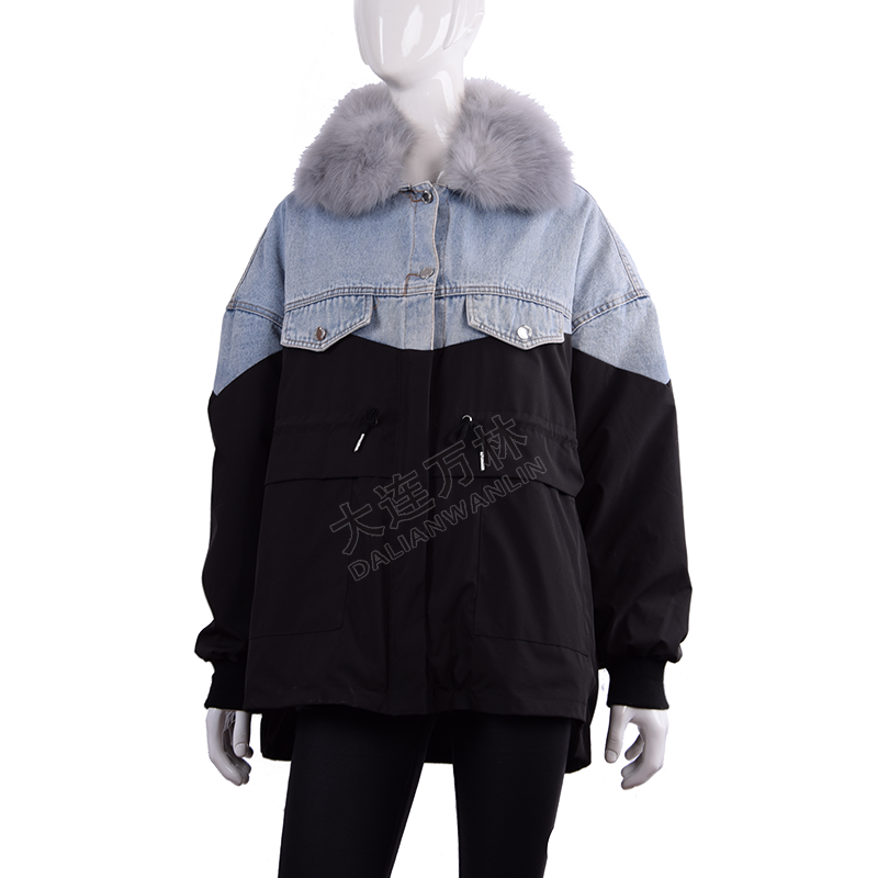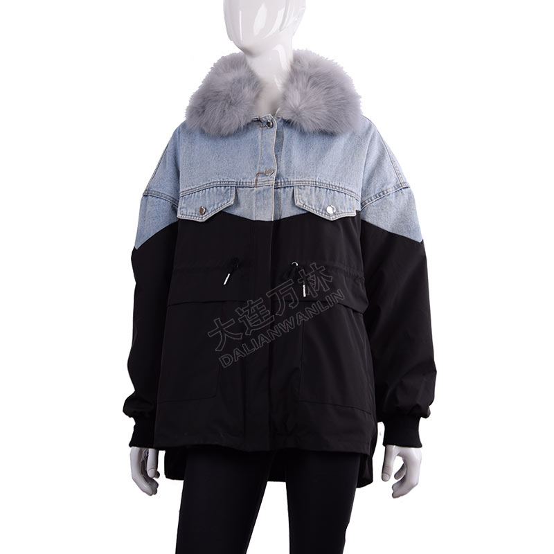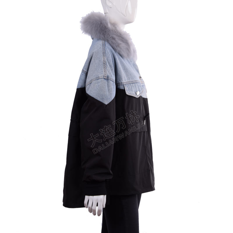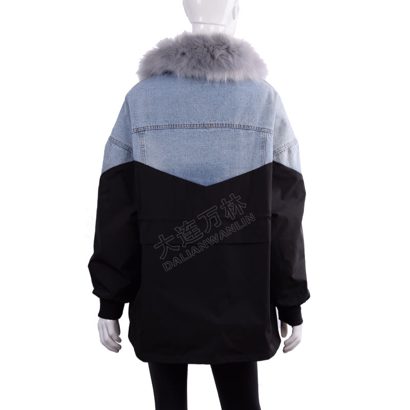 女士毛领牛仔拼接外套